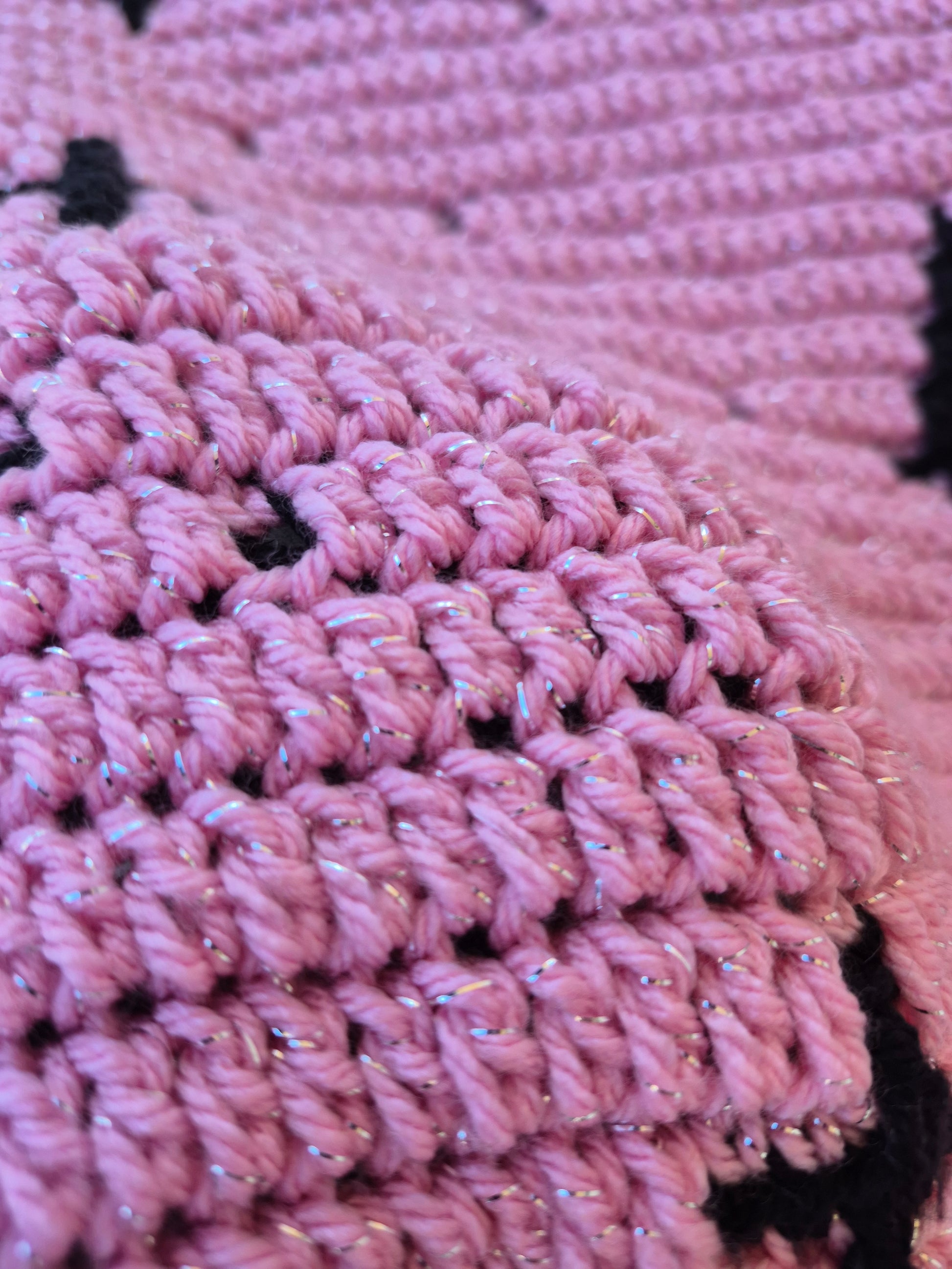 My Lil Baphomet design in silver threaded/sparkle medium pinks and black, made with soft 4/worsted weight yarn and trimmed with a black envelope border. 100% acrylic, washable on gentle/dry on low. Measures 62"x51"